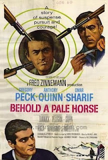 Behold a Pale Horse es una película estadounidense de 1964, protagonizada por dos grandes del cine norteamericano, Gregory Peck y Anthony Quinn. Basada en la novela Killing a Mouse on Sunday de Emeric Pressburger, el filme fue dirigido por Fred Zinneman y relata la historia de un guerrillero catalán exiliado en Francia. El principio del filme incorpora escenas de To Die in Madrid y utiliza una voz en off sombría para narrar los datos básicos de la guerra. Según parece, la producción de Columbia, después de visionar el filme por primera vez, incluyó el uso de metraje documental e información narrada porque pensó que la contienda había quedado relativamente olvidada en la memoria de los espectadores en este lado del Atlántico. En un principio, estos "recordatorios" fílmicos no estorban demasiado: el epígrafe del Apocalipsis (de donde viene el título); la voz en off; el sonido siniestro de castañuelas y las secuencias documentales de Rossif dan la sensación que vamos a ver una película seria y comprometida. Por desgracia, aparte de estos detalles, no sé mucho de la película porque era tan mala que no podía seguir viéndola. Hoy, pensándolo otra vez, creo que es uno de esos filmes que sirven muy bien para investigar (como en una ponencia o un artículo), aunque no se pueda disfrutar el visionado en sí. Hay muchos defectos en este intento de retratar la guerra a 25 años desde su "fin," y voy a resumir varios aquí, a pesar de sólo haber visto unos 15 minutos de la peli.