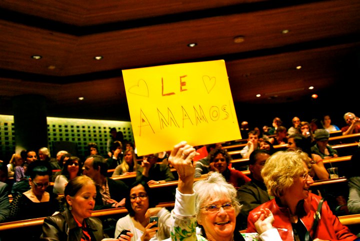 Durante mucho tiempo he leído del egocentrismo del juez, de sus apodos de "juez estrella" y "super juez," y he leído también las críticas que dicen que la figura de Baltasar Garzón y su juicio están quitando la luz del caso más importante y pendiente, que era y es el de las víctimas del franquismo. En un post reciente en su blog, María José Barreiro ha tachado el fenómeno del "progarzonismo que nos invade." Por supuesto, es imposible que un encuentro de 5 minutos con el juez pueda revelarnos mucho de su persona, pero a mí me impresionó que llevase tanto tiempo con cada persona que le quería hablar, especialmente cuando ya había hablado durante 2 horas. Es muy posible que -- de no ser estadounidense -- viera de una manera distinta al juez. Pero no vi durante su discurso un enfoque en el caso contra él (apenas se refirió a él -- habría que saber de él de antemano para leer entre líneas) o un interés en defenderse contra estas críticas de los últimos años. La conferencia demostró su capacidad intelectual, su conocimiento amplio del derecho, la historia y la política y su interés en defender a quienes no pueden o a quienes no se sienten capaces de defenderse. Sin duda, la conferencia iba dirigida principalmente a una audiencia progresista, pero tampoco la encontré especialmente crítica de partidos conservadores o derechistas.