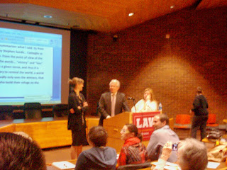 El momento más curioso de esta fase de preguntas era cuando una mujer le criticó a Obama al hacerle una pregunta al juez. Al principio, aunque hablaba en inglés, no entendí qué preguntaba y me dio vergüenza ajena. Vez tras vez, la mujer citaba lo que llamaba "the village idiot" (lit. el tonto del pueblo). "The village idiot tells me" (me dice el tonto del pueblo), decía, y terminó su propio discurso diciendo, "Will you defend the village idiot when he goes to Guantánamo?" (¿defenderá Ud. al tonto del pueblo cuando vaya a Guantánamo?). En un momento dado, creí entender que, desde su punto de vista, el presidente Obama merecía ser preso en Guantánamo. Pensé que debía ser de algún grupo marginal como del Tea Party, pero luego se me ocurrió que pudo haber sido alguien de la izquierda radical. El juez le ofreció una respuesta muy mesurada y tranquila. Ante todo, le dijo, "¿Y me toma por el tonto del pueblo,?" elicitando una risa un poco nerviosa del público. Pero luego, le respondió que mienten todos los políticos (una de las críticas de la mujer había sido que Obama mintiera durante su campaña electoral) y citó su participación breve en la política, en que le preguntó a un político si no le preocupaba no cumplir con las promesas de su campaña. El político contestó que "para eso existen las campañas electorales." Después, el juez le explicó a esta mujer que tenemos que actuar si no estamos satisfechos con la forma en que se hacen las cosas en la política. Dijo que hay demasiada gente que se contenta con leer un artículo o ver un programa de la tele para informarse. Hay que ir más allá de los medios y ser ciudadanos pro-activos.