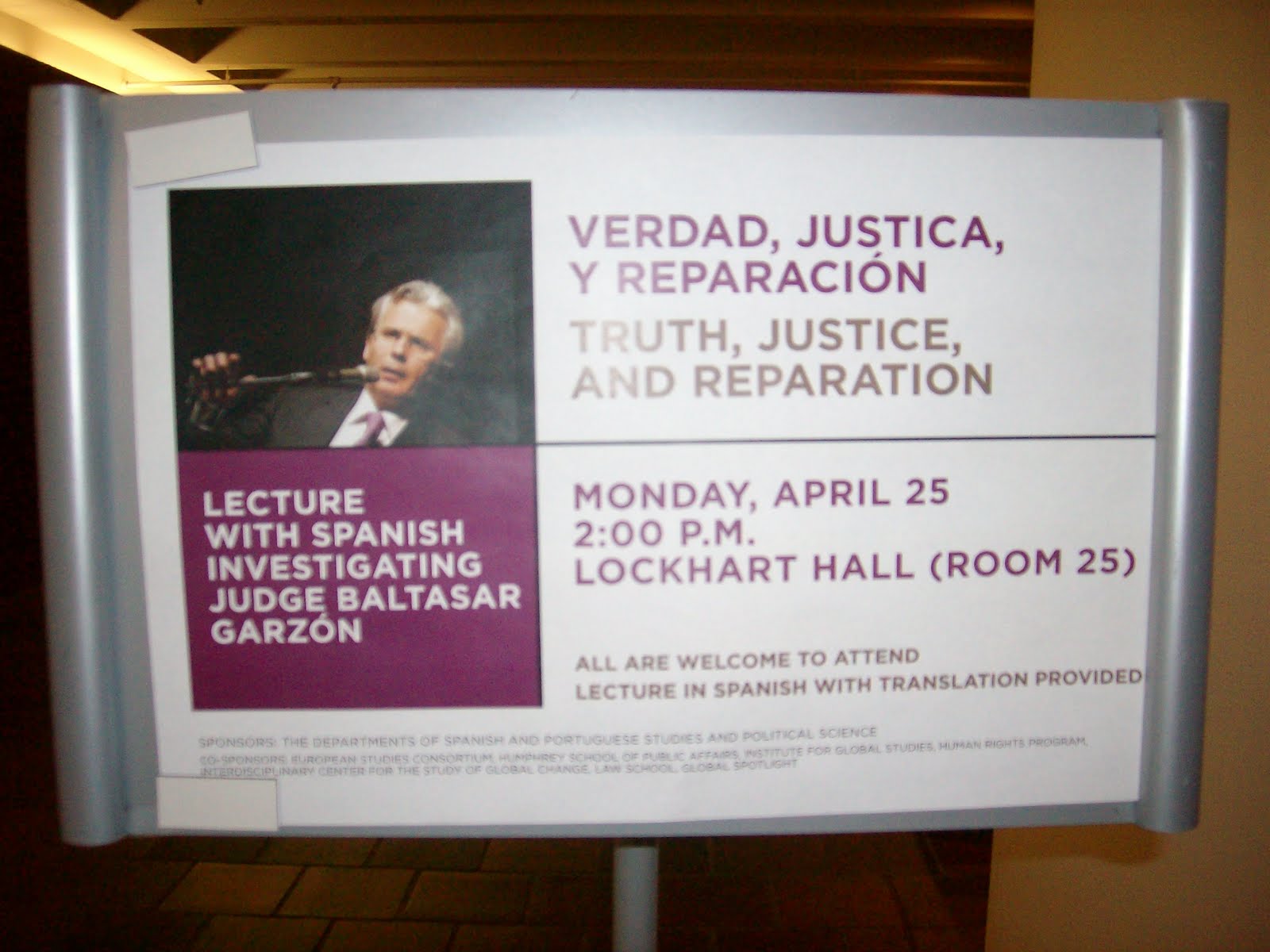 Antes de describir la conferencia del juez, tengo que decir que me alegra poderla haber escuchado en español. La "traducción simultánea" que habían prometido era, en realidad, una pantalla de ordenador proyectada detrás del juez. Por lo que parece, era un estudiante graduado de traducción que tuvo la tarea dificilísima de ir traduciendo todo lo que decía el juez, para que los no hispanohablantes lo pudiesen entender. No he estudiado mucho la traducción, pero algo sé, y es que tanto la interpretación como la traducción son trabajos agotadores, y se tiende a limitar el tiempo en que uno trabaja para asegurar la calidad de la traducción. El juez Garzón habló unas 2 horas sin parar, y aunque yo no seguía muy a menudo la traducción al inglés, pensé que seguramente se perdían ciertas ideas, porque sencillamente no es posible que una persona traduja y escriba al ordenador en tiempo real, especialmente cuando el hablante apenas tomaba una pausa. No sé por qué razón decidió la Universidad ofrecer una traducción así, pero probablemente habría sido mejor que hubiesen contratado a un traductor profesional o por lo menos, que hubiesen tenido presentes a varios traductores para aligerar el trabajo del primero. Si yo no hubiese entendido español, tengo la sensación de que no habría podido captar las ideas más importantes del juez. De ninguna manera es una crítica al juez, pero haber anticipado la extensión posible de su conferencia habría resultado en un mejor producto para los oyentes no hispanohablantes.