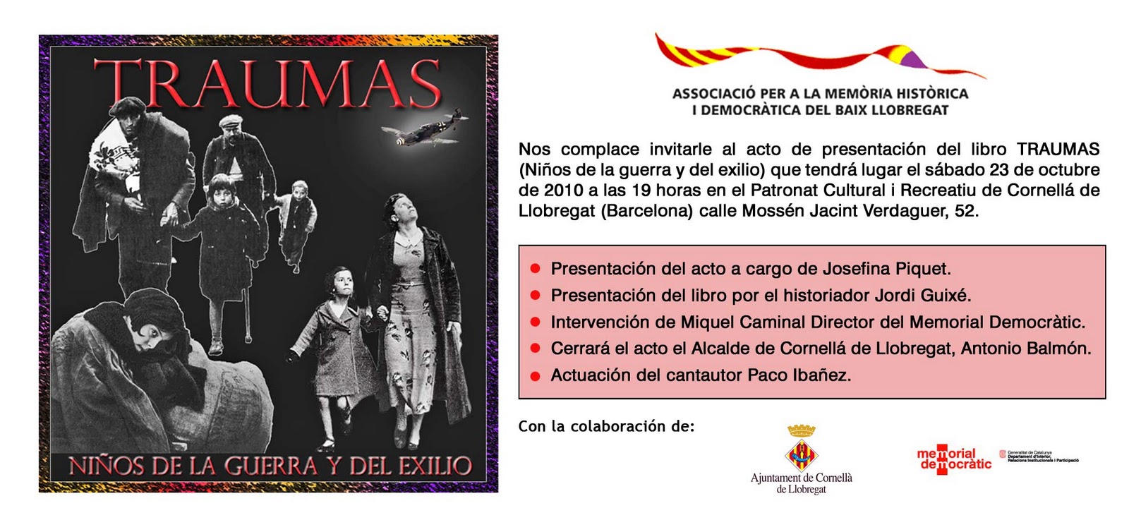 Me complace invitaros a la presentación del libro en el que participo "Traumas. niños de la guerra y el exilio" que tendrá lugar el día 23 de octubre en Cornellá.